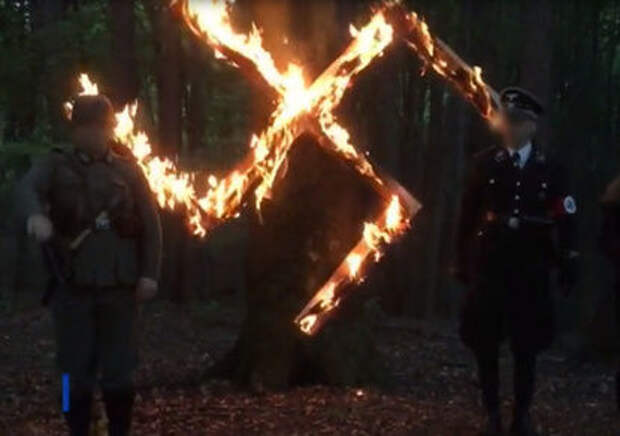 Камера зафиксировала "зигующих" молодых людей в одежде, напоминающей военную форму военнослужащих Верхмахта, флаги с нацистской свастикой и другую атрибутику Третьего Рейха.