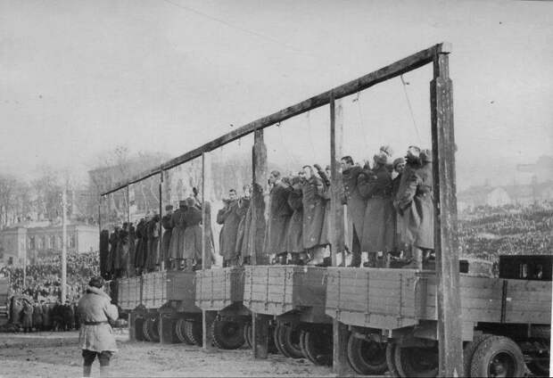 В СССР до этого высшая мера наказания была, но она была, как и в любой нормальной стране, тайной. Приговор приводили в исполнение без свидетелей, тела семьям не выдавались, захоранивались на кладбищах в номерных могилах. Теперь же введено повешение, и мало того – публичное, с указанием за что и с оставлением тел:...производить публично, при народе, а тела повешенных оставлять на виселице в течение нескольких дней, чтобы все знали, как караются и какое возмездие постигнет всякого, кто совершает насилие и расправу над гражданским населением и кто предает свою Родину.